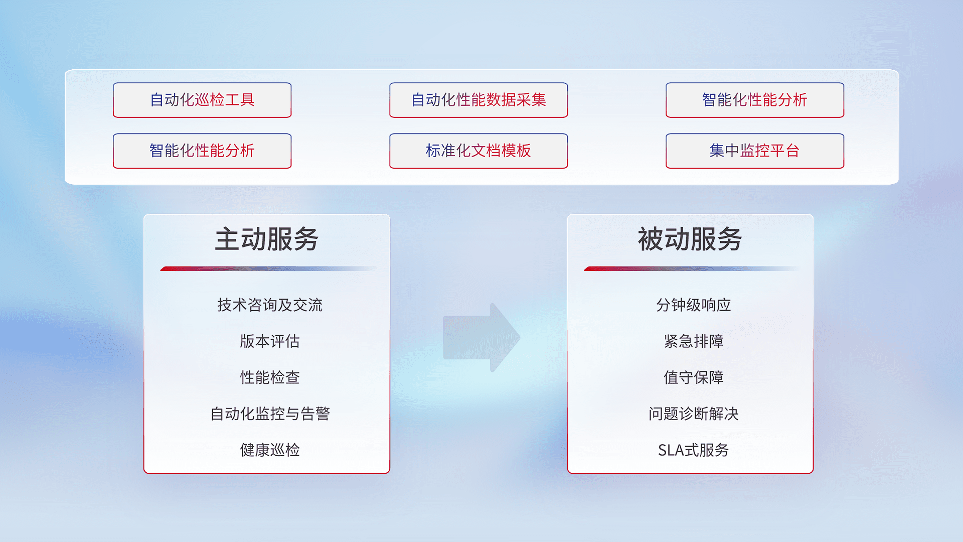 智能化工具和标准化文档,,保障服务质量,,,提供主动服务(包含技术咨询、、、、版本评估、、、性能检查、、、自动化监控与告警、、健康巡检)和被动服务包含(分钟级响应、、紧急排障、、值守保障、、、问题诊断解决、、SLA服务)。。。。